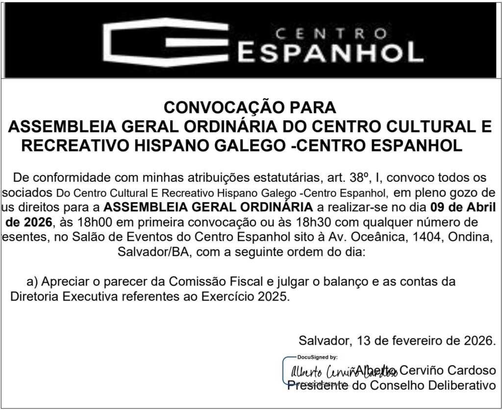 CONVOCAÇÃO DA ASSEMBLEIA GERAL ORDINÁRIA 09 de Abril de 2026 - Clube Espanhol